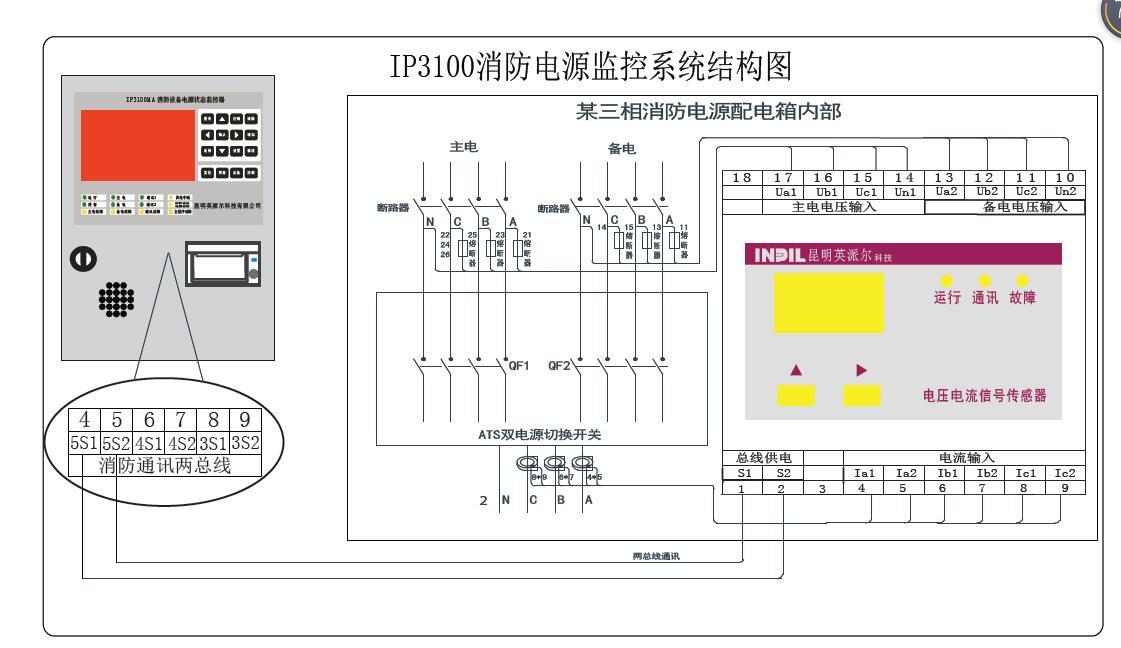收藏首頁(yè)消防設(shè)備電源監(jiān)控系統(tǒng)由消防設(shè)備電源狀態(tài)監(jiān)控器(IP3100MA)、傳輸線纜和與其連接的電壓信號(hào)傳感器、電壓/電流信號(hào)傳感器等設(shè)備組成。系統(tǒng)連接如下圖所示: