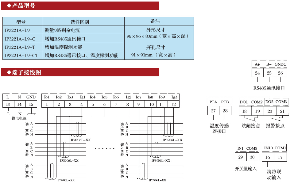 IP3221A-L9電氣火災監控探測器主要用于同時測量九路剩余電流和一路溫度,液晶顯示。