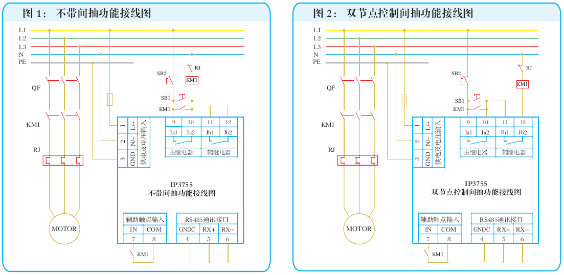IP3755低壓電機再起動控制器在間抽工作模式下,用戶根據需要可自由設置電機運行時間和停止時間(最小計時單位為6分鐘),同時可選擇單接點控制方式或雙接點控制方式。