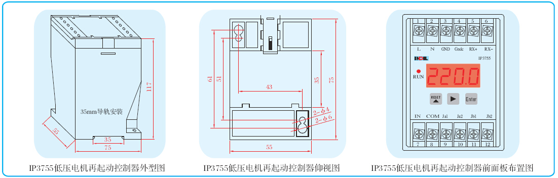 IP3755低壓電機再起動控制器實時監測電網電壓和電機的運行狀態。當正在運行的電機由于電壓波動而造成停機時,如果電網電壓在設定的允許時間內恢復正常,則電機按照預先設定的再起動時間重新起動電機;如果在設定時間內電網電壓沒有恢復正常,則閉鎖起動程序,不再起動電機;如果要解除閉鎖,則手動或遙控起動。現場若有多臺電機需要順序起動,只需將對應的IP3755設定不同的再起動延時時間就可以實現分批順序起動。通過RS485通訊網絡與控制中心連接,實現電機的遠程監測和控制。