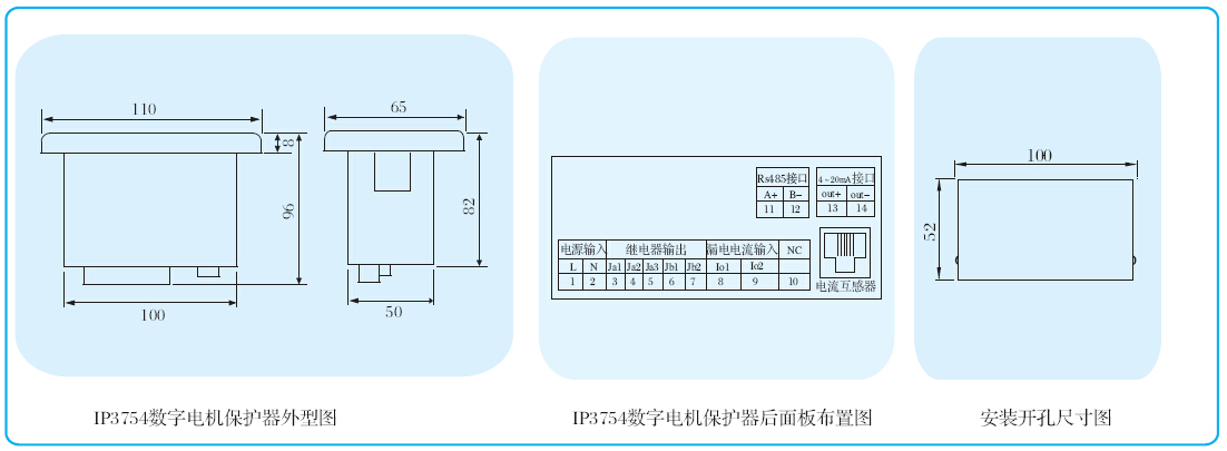 IP3754數字電機保護器(以下簡稱保護器)主要用于保護交流電壓220V,頻率50Hz,電流1000A以下的各種交流電機。具有過載、堵轉、輕載、不平衡/缺相、過壓/欠壓、短路、接地等故障保護功能,并有最大允許分斷電流保護以及參數測量、操作控制、遠程通訊等功能。其采用互感器與主體分離的電流輸入方式,需配合專用或通用CT模塊一起使用。