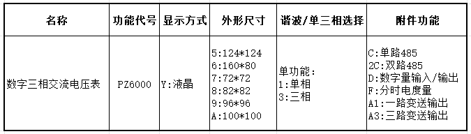 例:PD6000-Y90-CFA1表示96*96結(jié)構(gòu),不帶諧波,RS485通訊,帶變送輸出,帶分時(shí)電度量。