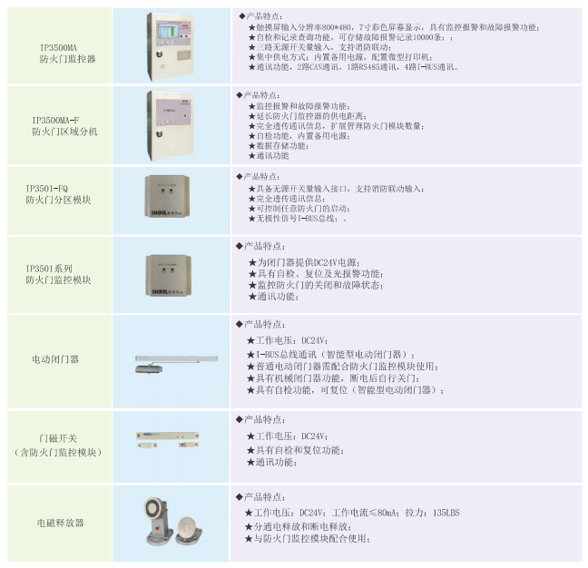 IP3500智能防火門監控系統包括IP350OMA防火門監控器 、 IP350OMA-F防火門區域分機 、 IP3501 -FQ防火門分區模塊 、 IP3501系列防 火門監控模塊 、 電動閉門器 、 門磁開關 、 電磁釋放器等 。實時監測防火門的狀態信息 。